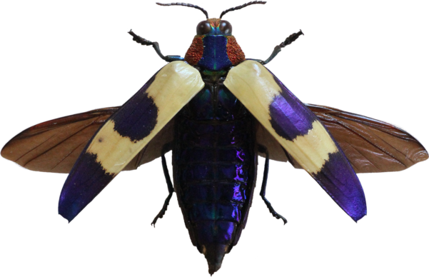 Un grand coléoptère originaire d’Asie du Sud-Est. Sa carapace présente des couleurs intense, du bleu principalement, avec de l’irisation.