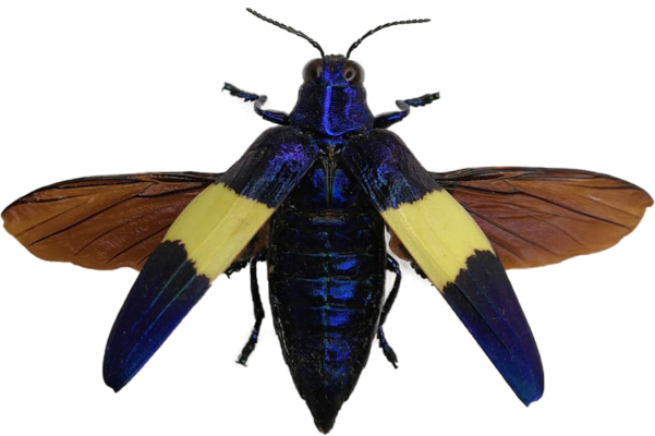 Ses élytres présentent des couleurs intenses, du bleu principalement, avec de l’irisation.